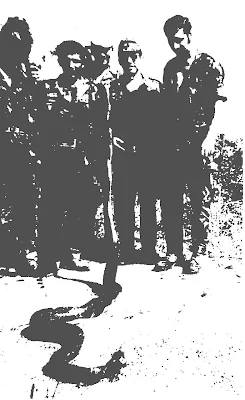 Recuperados da emoção, os homens começaram o seu trabalho e eu dirijo-me para um tronco de árvore, que estava caído, para me sentar. Ao aproximar-me do tronco, este mexe-se. Era uma gibóia, com sete metros de comprido. Enfiei-lhe um carregador em cima e ela continuava bem viva. O Cabo enfermeiro Luís, agarra num tronco de um ramo verde, e, pondo-se à frente dela, bate-lhe continuamente na cabeça, até a cobra se ver perdida.