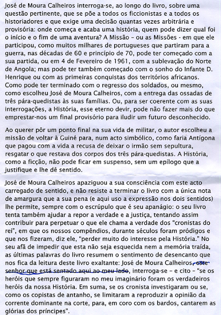 A obra tem a chancela da Editora Caminhos Romanos, com sede no Porto. O texto do discurso do cineasta chegou-nos às mãos, enviado pelo Moura Calheiros [, foto à direita, ] com a seguinte nota: "Talvez tenha interese para o blogue, segue em anexo a intervenção de António-Pedro Vasconcelos, que é uma brilhante peça literária".Com a devida autorização do próprio, queremos também partilhar aqui, no nosso blogue, as quatro páginas do discurso de um dos nomes mais conhecidos do moderno cinema português (**) para quem "a História, tal como a ficção, não pode ficar em suspensa sem um epílogo que a justifique e lhe dê um sentido"... É esse também o sentido do livro deste militar que honrou a sua Pátria e as forças pára-quedistas que comandou nos três teatros de operações, em África, de 1961 a 1974. (LG)