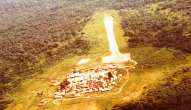 Guiné > Região de Tombali > Guileje > CCAÇ 3325 (Jan/Dez 1971) > Foto do álbum do cor inf ref Jorge Parracho > Foto aérea de Guileje (tabanca, aquartelamento e pista de aviação). São visíveis os espaldões das pelas de artilharia 11.4, apontadas para a fronteira com a Guiné-Conacri, a sudeste.