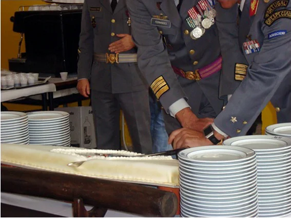 Assim, à hora previamente combinada, 10H30 horas, apresentei-me na Unidade onde fui recebido pelos responsáveis pelo protocolo, que nos convidaram, sim a Manuela ia comigo, a aguardar na Messe de Sargentos, transformada em sala de recepção e onde ofereciam aos presentes uma “bebida para ambientar”.