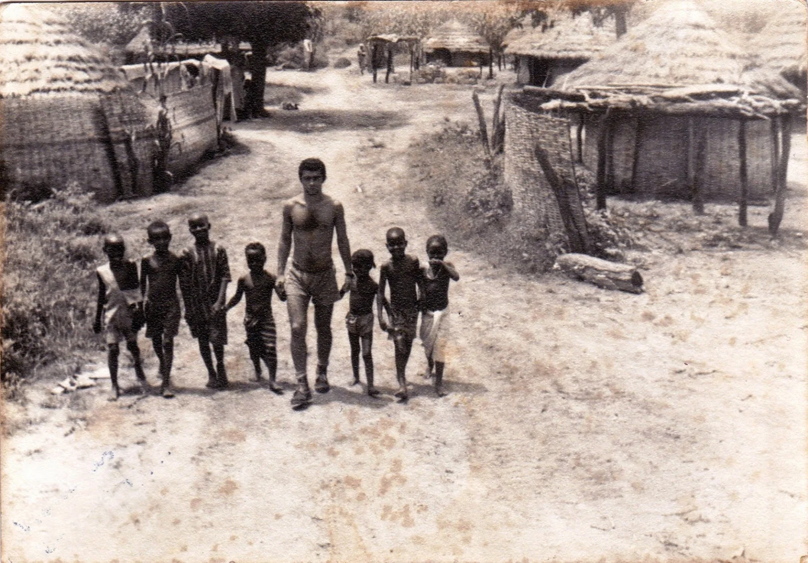 Esta fotografia retrata bem o que para mim foi (enganosamente) um epílogo de guerra: uma tabanca sossegada, sem o mínimo vestígio de violências, eu em trajos civis passeando com crianças alegres (as crianças eram filhos dos nossos soldados e tinhamos acabado de jogar à bola).