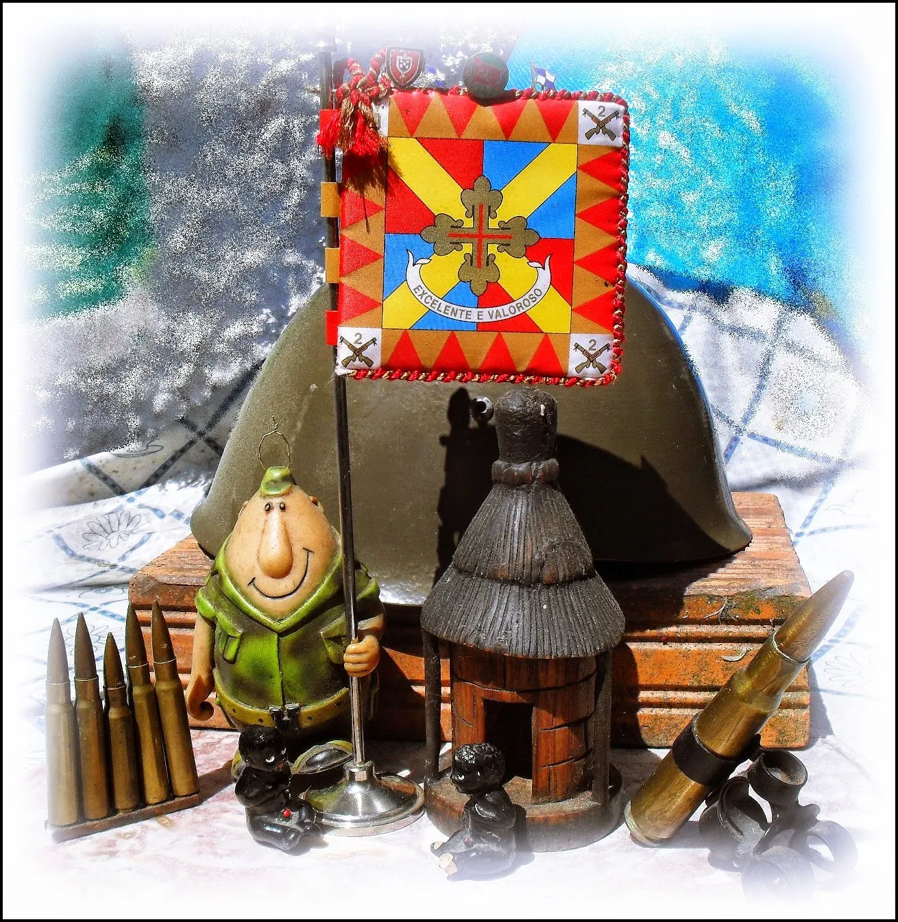 É uma composição singela: o galhardete do BCAÇ 2879, o boneco do PIFAS, uma miniatura de uma morança, as munições da G3 e da mauser (?),,, É uma composição fotográfica interessante, e sugestiva...