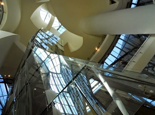 Qual Richard Serra qual Georges Braque, quais exposições temporárias, primeiro quero andar na vida airada, a confirmar o que se escreve no prospeto de boas-vindas: “O edifício está composto de uma série de volumes interconectados, uns de forma octogonal e recobertos de pedra e outros curvados e retorcidos, cobertos por uma pele metálica de titânio. Estes volumes combinam-se com paredes de vidro que dotam de transparência todo o edifício. Devido à sua complexidade matemática, as sinuosas curvas de pedra, vidro e titânio foram desenhadas por computador. O calcário foi a pedra escolhida, devido à sua tonalidade, funde-se perfeitamente com a fachada da Universidade de Deusto”. E sigo embasbacado, já vi este miolo dezenas de vezes em livros e revistas, mas isto é como a Praça Vermelha ou a Pirâmide do Louvre ou ao Centro Georges Pompidou, é preciso ver claramente visto com os nossos olhos, naquele dia e àquela hora, é com satisfação que vos dou as imagens que iam empolando o meu estado de espírito, sentia-me muito feliz: