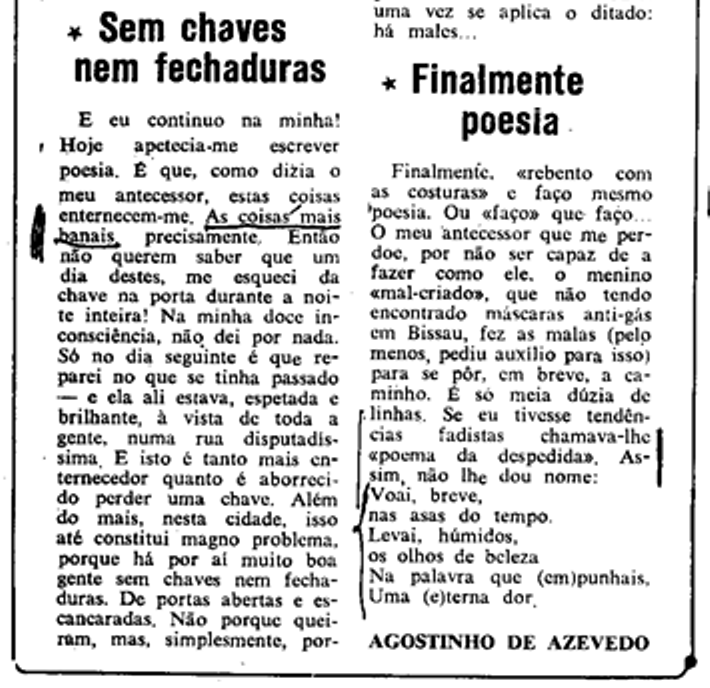 Creio que na noite de Natal de 1973, propus fazermos uma sessão de poesia em que cada militar faria poesias para ler ou recitar ou ler poesias de poetas, porque lera no jornal «Voz da Guiné» um escrito em que o chefe da redacção, alferes miliciano, Agostinho de Azevedo, que, depois, foi director do