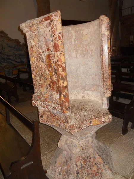 Estou a lutar contra o tempo porque o tempo está a mudar, o céu embaciou-se, sem aquela luminosidade perco o prodígio da cor da brecha da Arrábida. O coro baixo é elegantíssimo, percebe-se bem como a humidade é o grande inimigo oculto, aliás o Convento, mesmo ao lado anda num restauro que custa uns bons milhões, barrar o caminho a esta humidade tem muito que se diga. Veja-se um pormenor da beleza azulejar, é uma cercadura de volta inteira e que qualidade a da oficina que por aqui andou. O viajante deteve-se diante do púlpito, cirandou e voltou a cirandar, não que o púlpito tenha uma pedra trabalhada que corte o fôlego, é a intensidade da brecha, a sua explosão mineral e a singularidade da cor, inacreditável, é preciso mesmo ver.