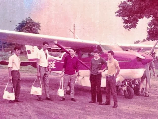 Foto nº 1 > Viagem de avioneta civil, até Bissau, para gozo de licença de férias na Metrópole. O Luís Nascimento é o mais alto, o segundo a contar da esquerda Não se consegue distinguir o logo do saco de viagem: se era o logo da TAP - Transportes Aéreos Portugueses, se era o da TAGP - Transportes Aéreos da Guiné Portuguesa (voos internos). Mas devia ser da TAP, vi um exemplra, no sábado passado no núcleo museológico da Tabanca dos Melros, oferta do nosso camarada Carlos Silva.