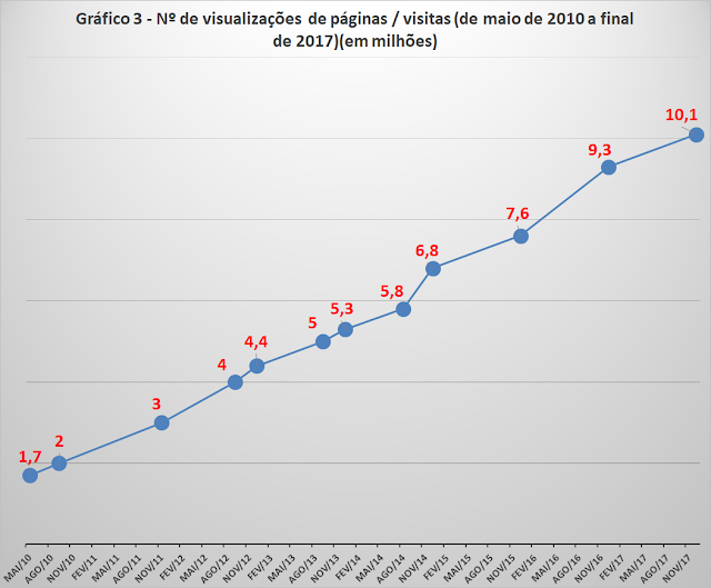 1. O nosso blogue atingiu, no final do ano de 2017 (em rigor, até 7/1/2018) (*), a cifra de 10,1 milhões de visualizações de páginas (grosso modo, de "visitas", o que não é exatamente igual a "visitantes"...), segundo as estatísticas do nosso servidor, o Blogger: 8,3 milhões, desde maio de 2010, a que acrescem mais 1,8 milhões desde o início, em 23/4/2004. (Gráfico 3).
