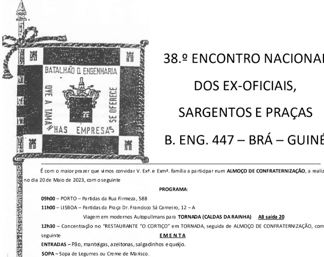 Anúncio do 38.º Encontro Nacional dos Ex-Oficiais, Sargentos e Praças, BENG 447, Brá, Guiné, a realizar nas Caldas da Rainha, no restaurante O Cortiço, em 20 de maio de 2023.
