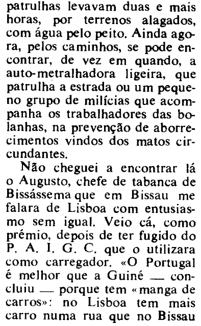 Mais uma surpresa, uma bibliotecária dedicada deixou-me em cima da mesa de trabalho na Sociedade de Geografia de Lisboa uma revista que desconhecia totalmente, e de que não encontro referências no google, a Cartaz, pelo título palpita-me tratar-se de uma publicação do SNI, revista mensal de cultura, informação e turismo. O conteúdo tem a ver com a visita de Silva Cunha à Guiné, em março de 1970, nada que não esteja já registado. A novidade é a colaboração de Horácio Caio, não se sabe ao certo se também viajou na comitiva ministerial, já escreveu sobre a Guiné e o último livro de reportagem claramente em defesa do Ultramar é da sua lavra, já caminhamos para o 25 de Abril. Foi o primeiro repórter de guerra, terá ido pelo menos três vezes à Guiné, e podemos juntar o seu nome a Amândio César, José Manuel Pintasilgo, Dutra Faria e Avelino Rodrigues (este entrevistou Spínola, que numa dessas peças publicadas no Diário de Lisboa teve uma tirada bombástica, revela-se favorável à autodeterminação). Enfim, tratemos estes documentos como reportagens pró-regime (não será o caso das de Avelino Rodrigues), Horácio Caio era jornalista da Época (jornal do regime que sucedeu ao Diário da Manhã).